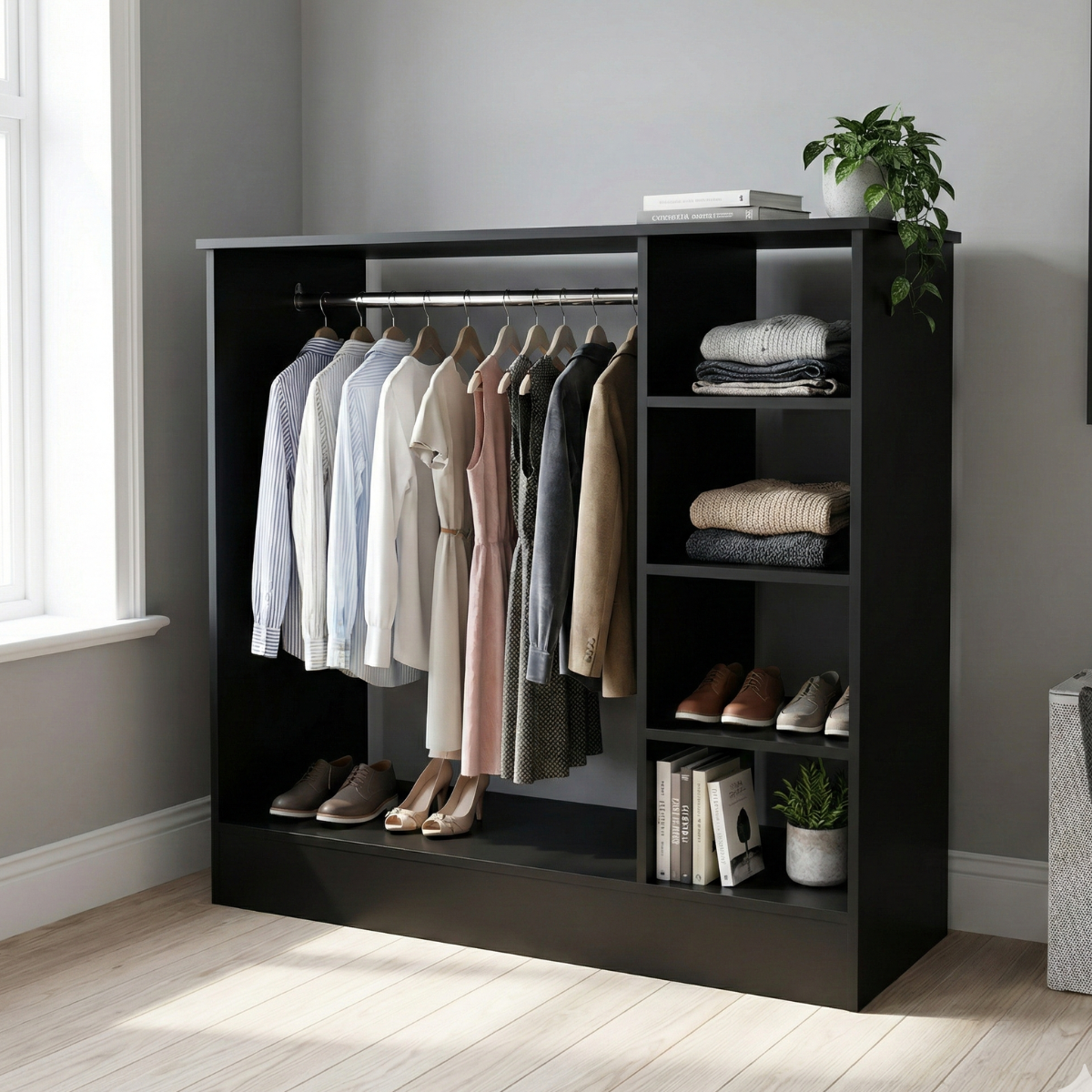 Procurando um Balcão Expositor Central para a sua loja? Apresentamos o Balcão Expositor Arara Central G2 com Cabideiro e Nichos para Loja - MDP Preto, um item elegante e funcional que irá aprimorar a apresentação dos seus produtos!