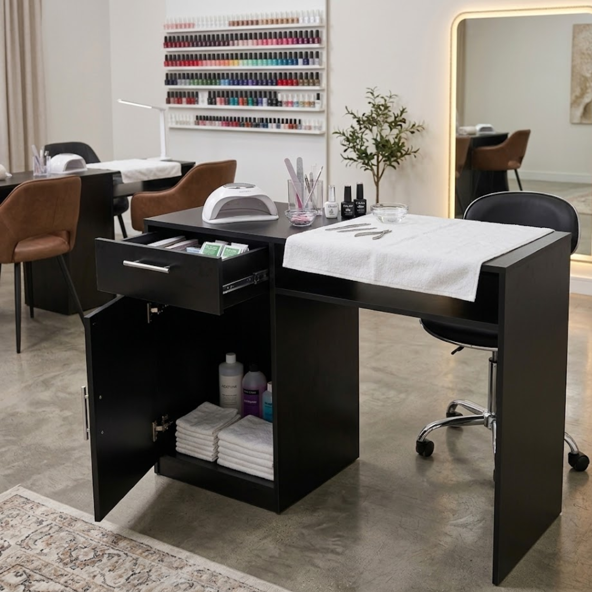 Escrivaninha Multiuso Klithovit Decor – Elegância e PraticidadeIdeal para salões de beleza, manicures ou home office, esta mesa combina design moderno com a resistência do MDF 15mm. Perfeita para organizar suas ferramentas de trabalho com estilo.