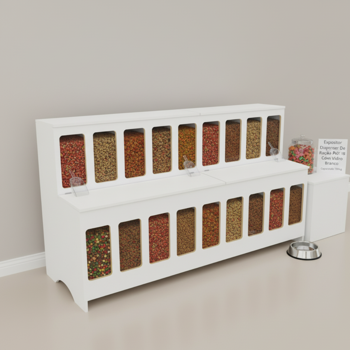 Organize sua loja e valorize seus produtos com nosso expositor de ração a granel. Design limpo, prático e com acabamento de alta qualidade.