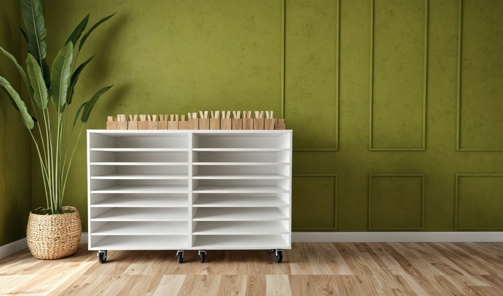 Ideal para comércios, papelarias e ateliês, este armário com 8 nichos é perfeito para organizar cartolinas, ColorSet, EVAs e outros materiais. Prático, com rodízios de gel (2 com trava) que facilitam o transporte e garantem estabilidade.